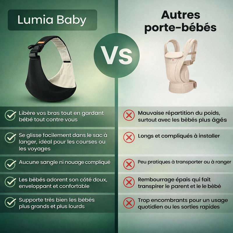 Le porte-bébé LUMIA BABY convient aux bébés capables de bien tenir leur tête. Il est idéal pour un usage quotidien en toute sécurité.